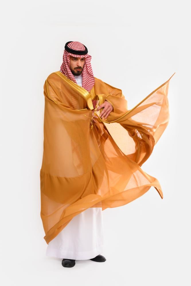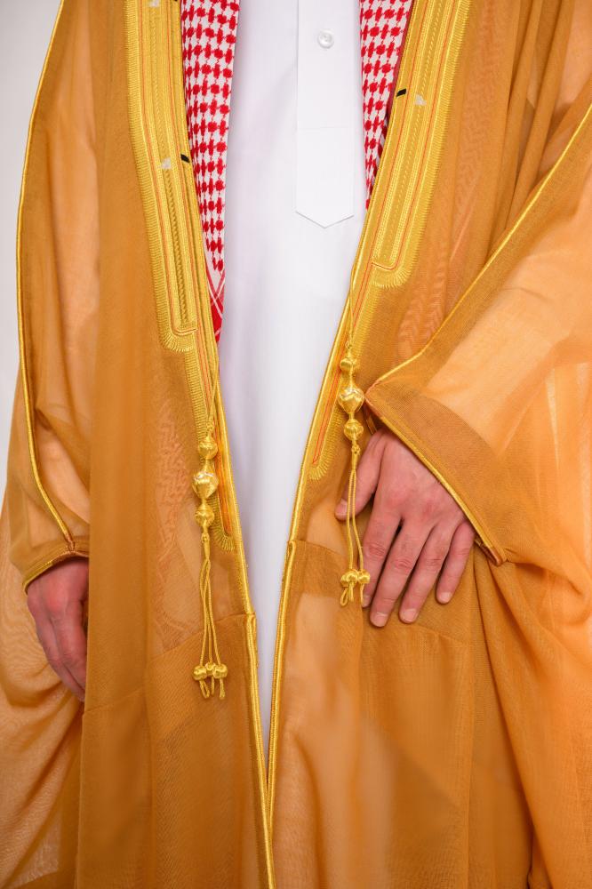 قماش غاط رويال زعفراني بالاضافه الي تطريز زري خيوط بيور سيلفر نقشه ملكيه وبند سلطان