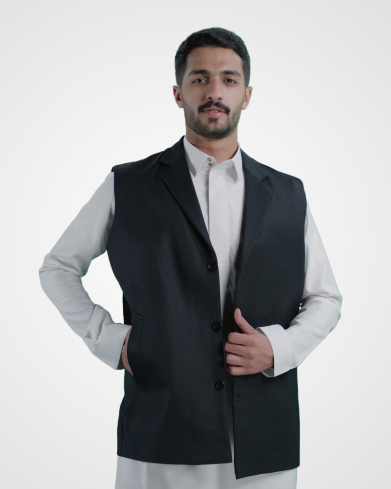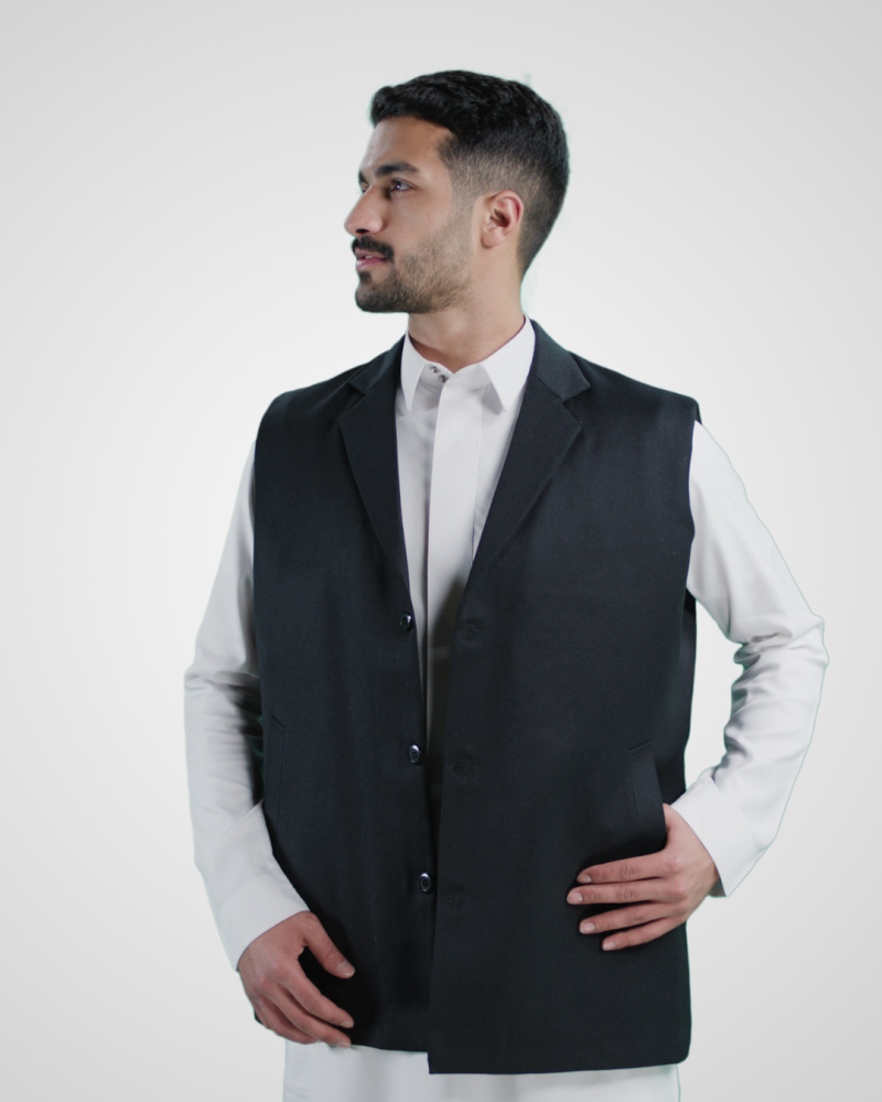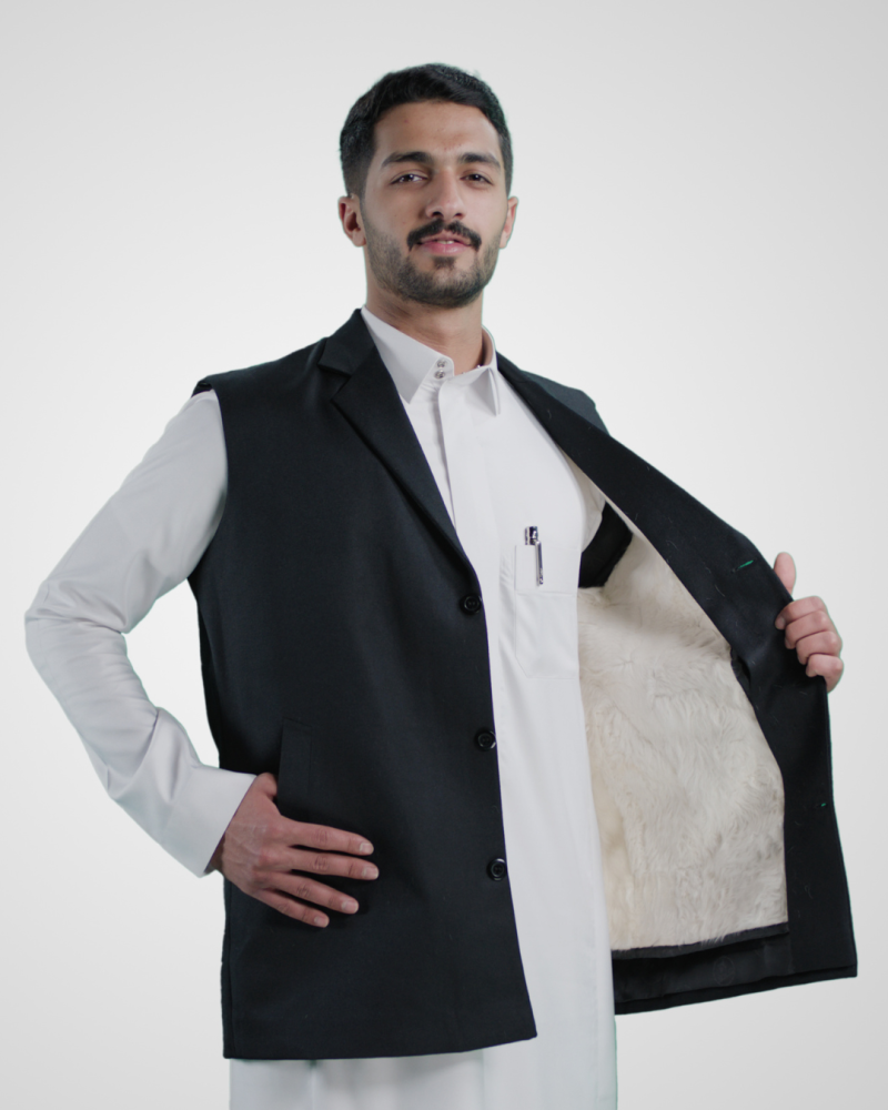 100% wool fabric vest on the outside, covered with parasitic leather on the inside.